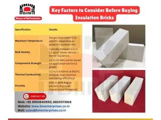 To get the best thermal efficiency and long-term performance in high-temperature applications, it's important to choose the right insulation bricks. Before you buy from BM Enterprises, we suggest you consider three important things. First, check the temperature resistance. Make sure the insulation fire bricks can handle the highest temperature that your furnace or kiln can reach without breaking down. Second, density: insulation bricks with lower density keep heat in better and save energy, while bricks with higher density last longer. Third, compressive strength tells you how well the brick can handle mechanical loads without breaking or cracking. BM Enterprises is a trusted manufacturer of insulation bricks. They make high-quality insulation fire bricks that are perfect for industrial furnaces, kilns, and other places where heat is a problem. These bricks are strong, durable, and provide good thermal insulation.